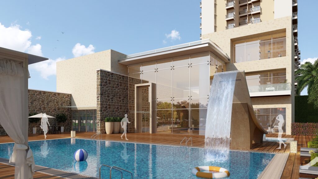 The grand entrance lobbies to the towers overlook the central lawns and visually connect the external peripheral road with the overall landscape. Each element constitutes a landscape that is structured to inspire a tapestry of oriented patterns. Moving throughout the site one continuously discovers, utilises, and interacts with various innovative landscape and hardscape elements specially created to enrich the outdoor living environment, at the same time enhancing the community living. This development also features a dedicated sports area with playing courts and a luxury club with a lap pool and a kiddie pool.