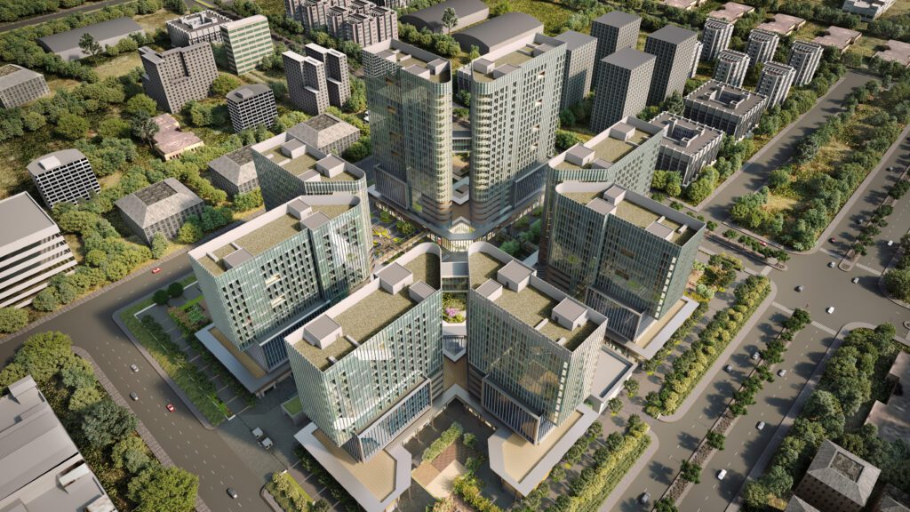 Two 45-meter-wide arterial boulevards cut across the site, easing traffic circulation and guiding vehicular traffic to the basement. The project reconciles nature with culture by redesigning the matrix-like- grid layout in an eco-friendly infrastructure.