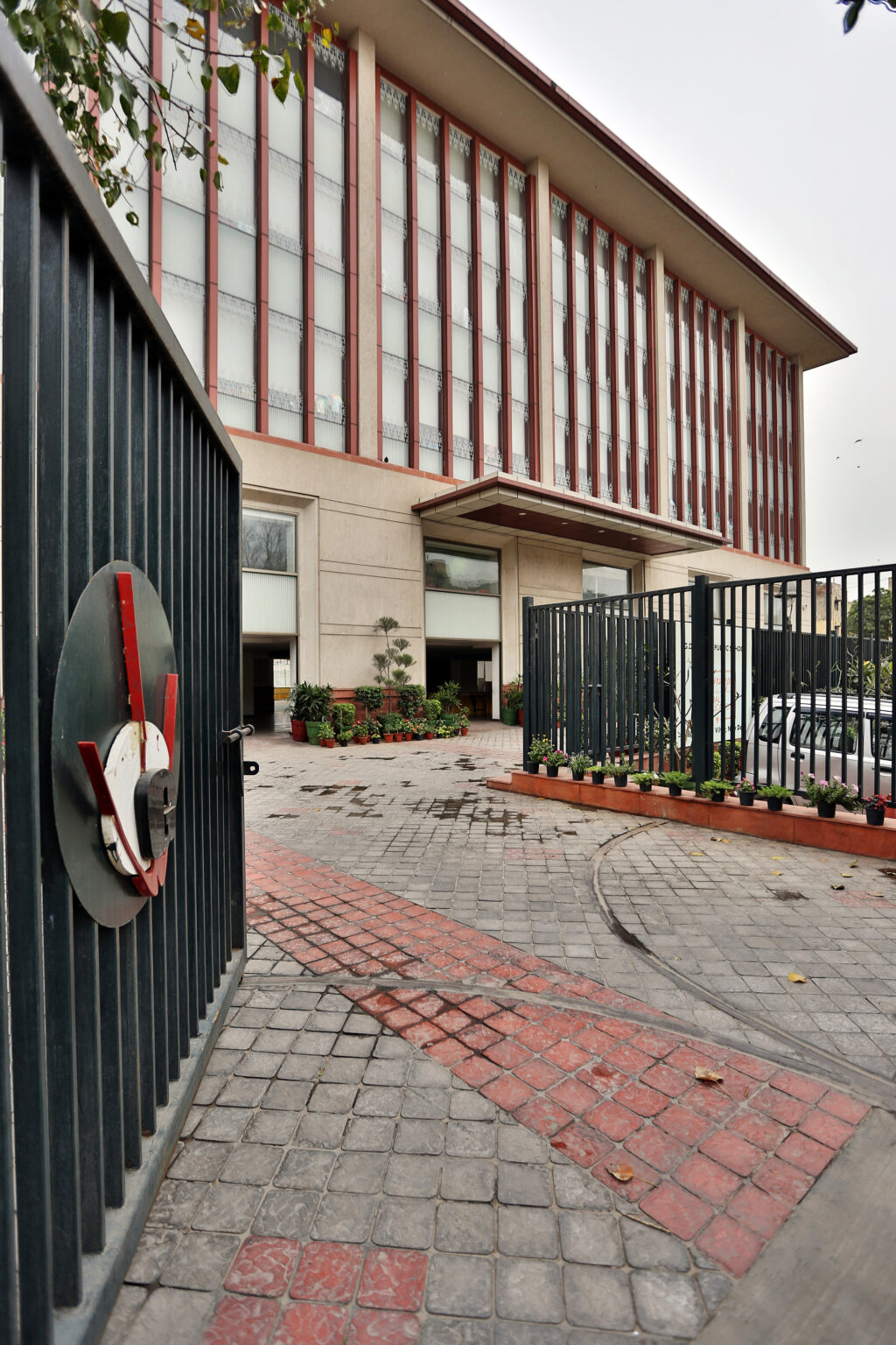 A four-floor high screen encloses the central zone and has a rubberised floor patterned to be used for gymnastics and other indoor sports. The architectural vocabulary uses traditional materials like Dholpur and Agra stone juxtaposed with transient materials like Aluminum and glass. Aiming to establish an external visual character in sync with the colours of Delhi, typical brick patterns are done away with in favour of the local Dholpur stone and Agra stone.