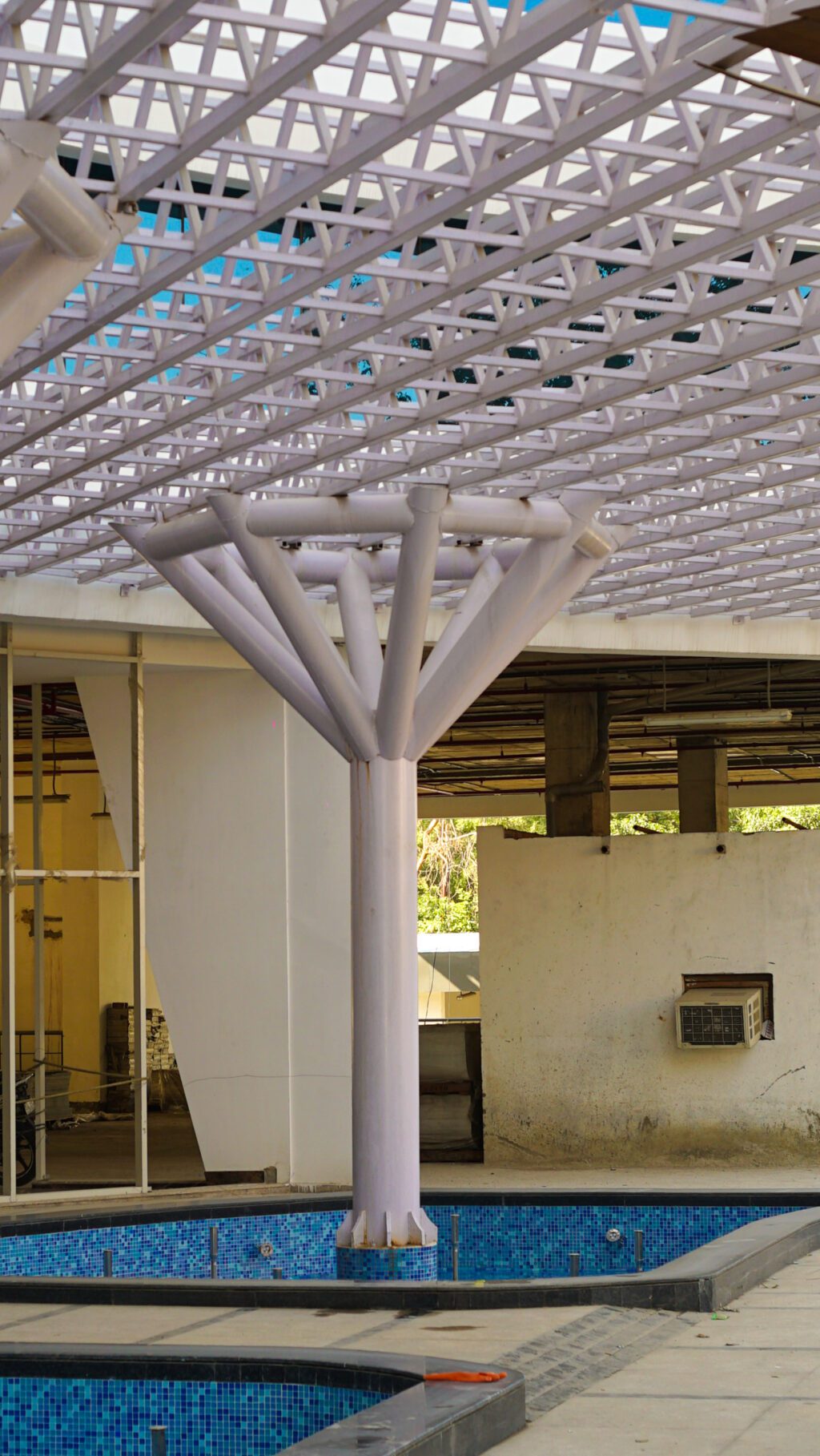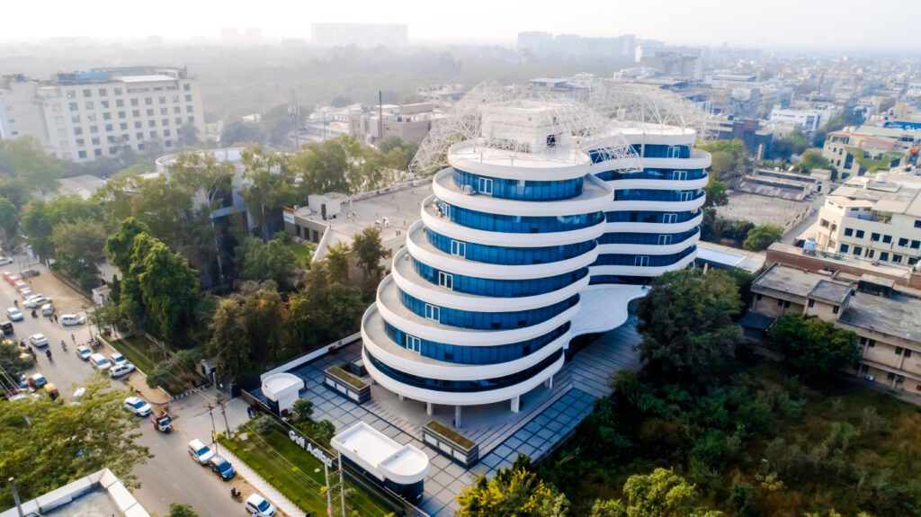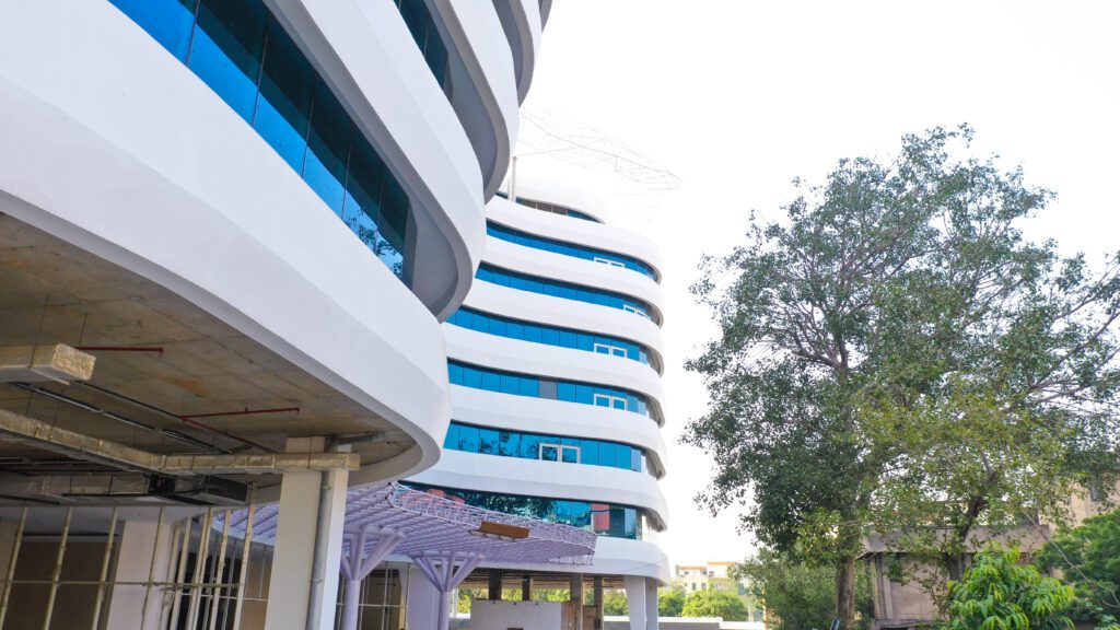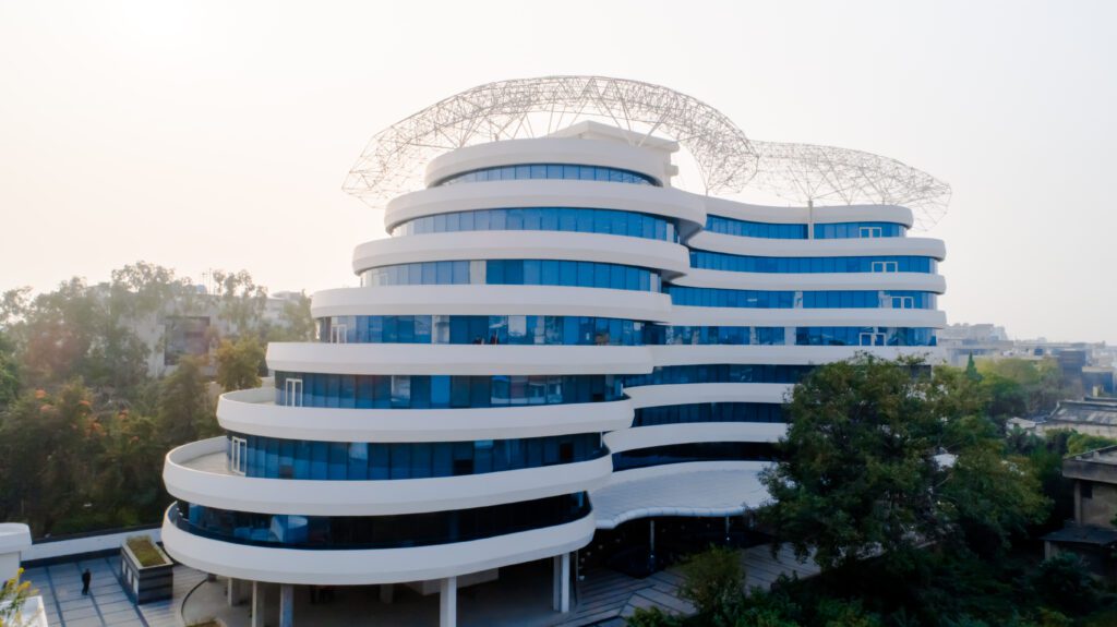 An east-facing entry court creates landscaped zones away from the neighbouring noise and pollution. The porous ground level allows ample natural light and ventilation into the built volume and illuminates many interactive and recreational spaces in the interiors. The site is planned with Vastu considerations in mind by responding with a northeast entrance and a marked water body. The stepped built-form recedes from South to North, ensuring that all internal courts get sufficient sunlight throughout the day.