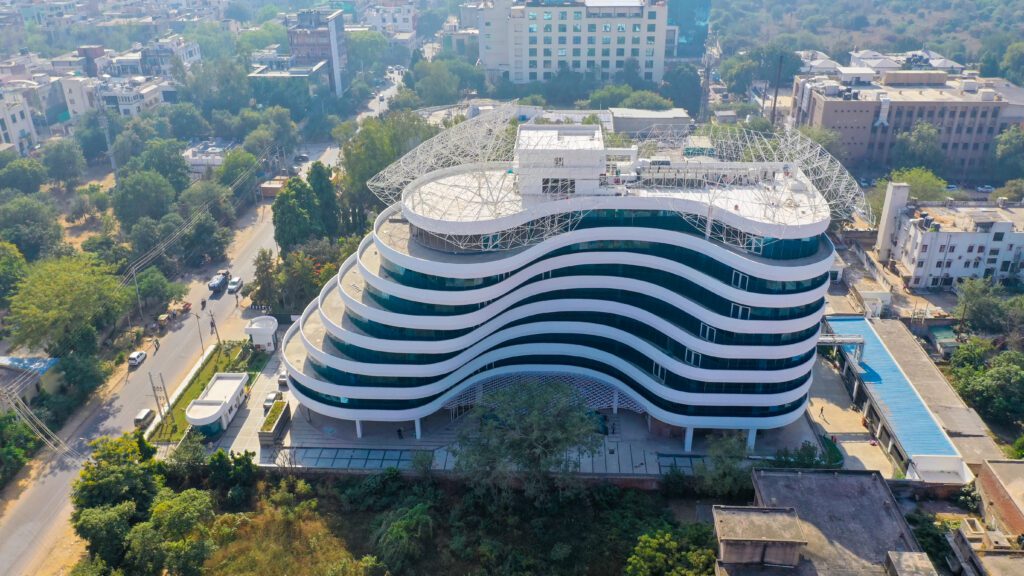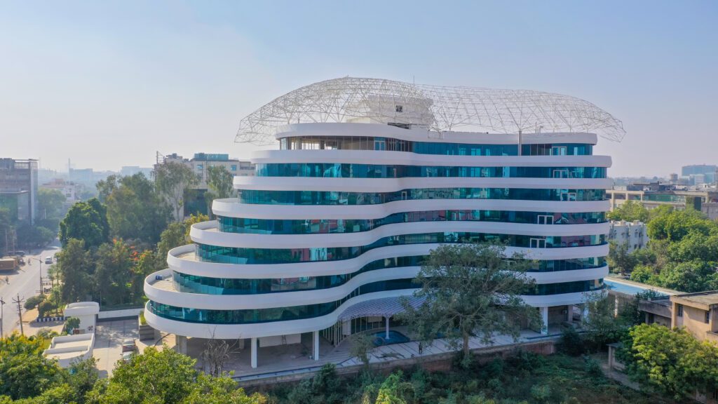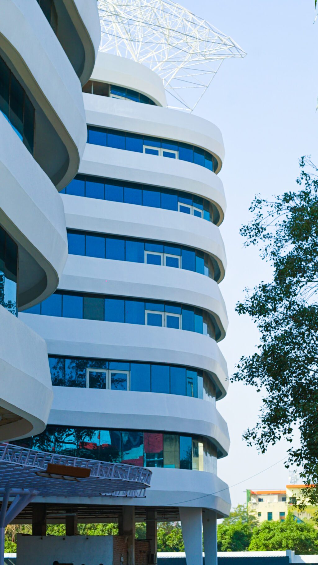 With a lack of input from the site context and no significant views directing the design direction, the building facade turns the introverted built volume on its head with a rhythmic curvilinear facade spanning above the lintel. The continuous fluid form is inspired by nature and achieves an iconic visual identity with gradual stepped terraces. Spread across seven floors and with a stilted open space, the design frees up the ground floor to bring in light and air circulation.