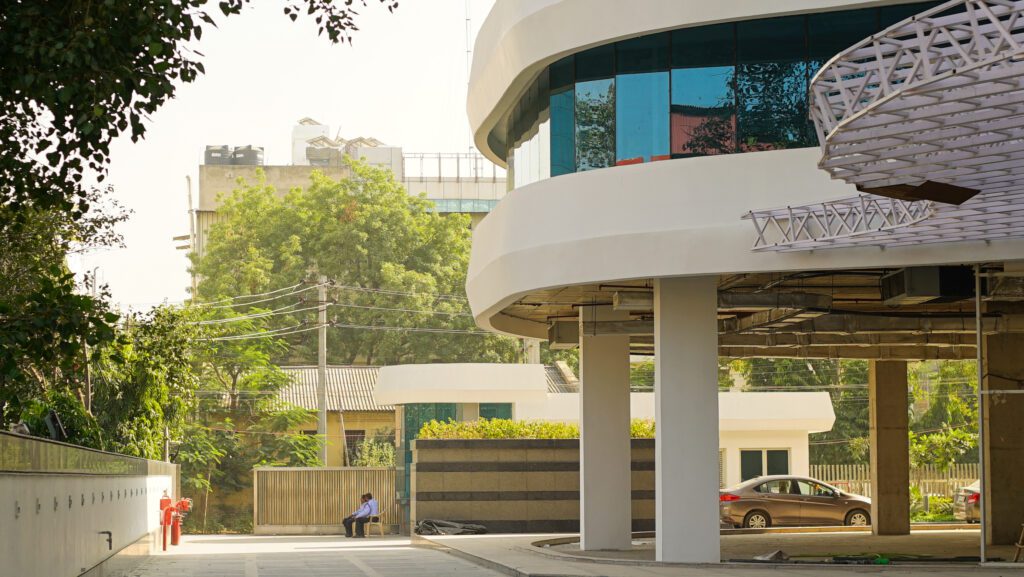 Located in suburban NCR near South and West Delhi, the Gulf Adiba is a proposed IT/ ITES office complex located in Udyog Vihar Phase II, Gurugram. Nestled inside a 4000 sq m industrial plot with a permissible ground coverage of 40 %, the 7-storey structure was naturally subdued in nature by virtue of its size.