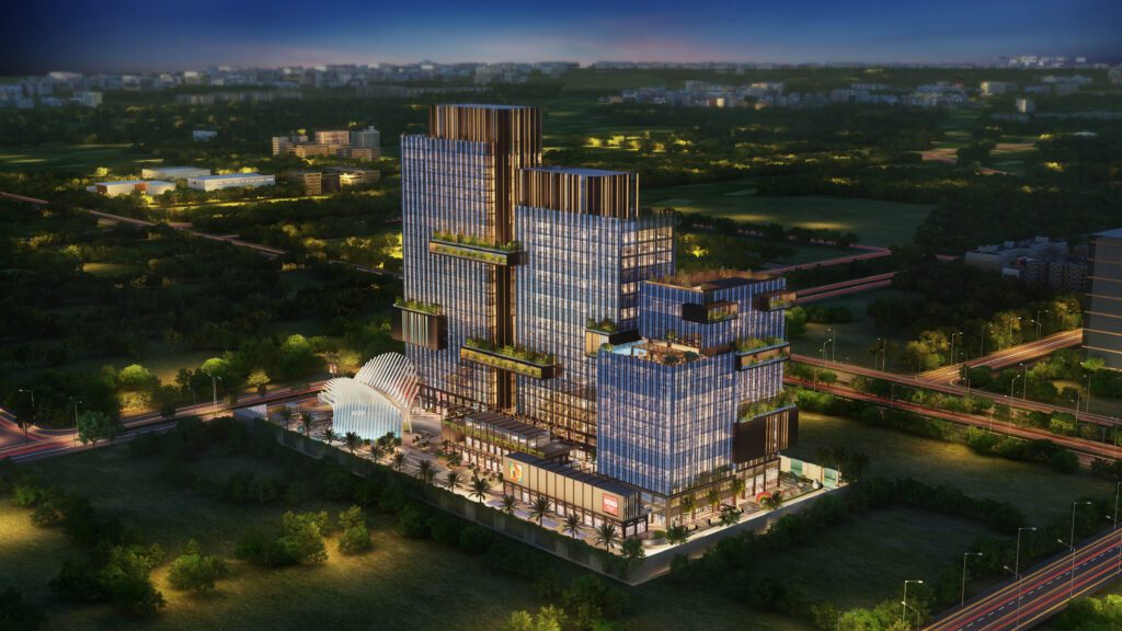 Transcending the traditional glass box facade, Mentis prioritizes climate responsiveness and Vaastu principles through thoughtful site planning. The tallest tower is strategically positioned in the southwest, shading the central plaza throughout the day and providing relief from the harsh sun. Retail spaces in the northeast and east bask in natural light, creating vibrant storefronts ideal for pedestrian activity.