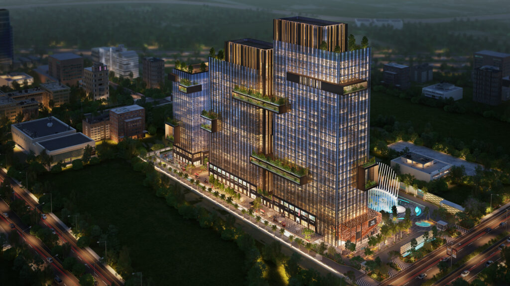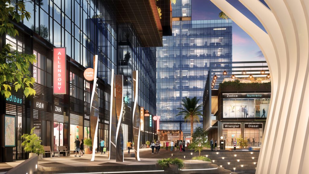 This meticulous planning fosters a vibrant, open-air atmosphere, transforming the typical concrete jungle into a sensorial promenade. The architectural language balances the verticality of the towers with horizontal elements, colors, diverse building materials, and biophilic design to integrate nature and break the monotony.