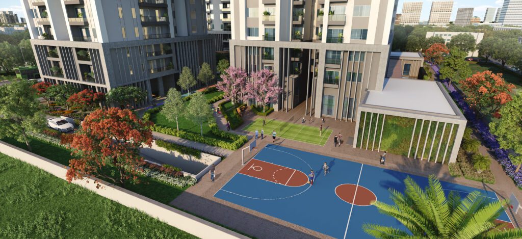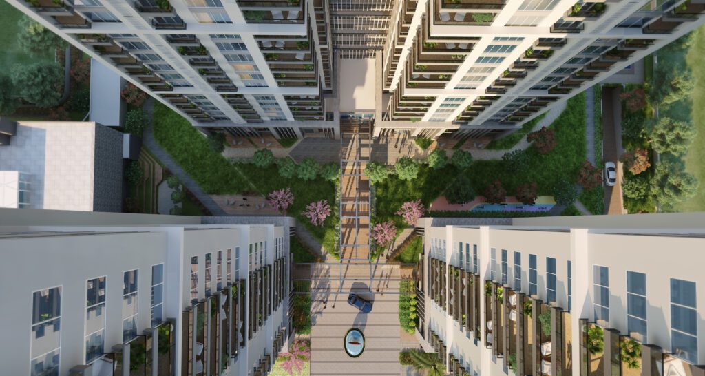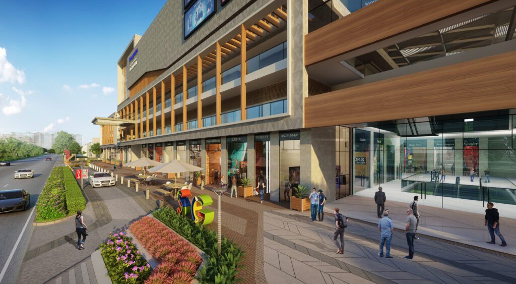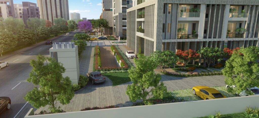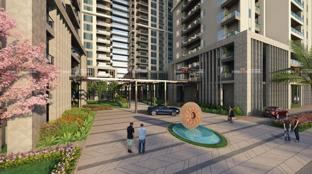The site’s geometry influenced the zoning, dedicating an elevated frontage to a commercial plaza and the rest to lofty residential towers. The mixed-use strategy optimally integrates living, working, retail, and recreation, ensuring a dynamic urban experience. With meticulously planned pedestrian and vehicular circulation, three high-density residential towers offer 360° views, complemented by green spaces designed for accessibility. State-of-the-art amenities, including a plush clubhouse, spa, pool, and more, enhance the luxurious lifestyle. The commercial segment adopts a ‘Promenade Retail Architecture,’ fostering a vibrant urban commerce hub.