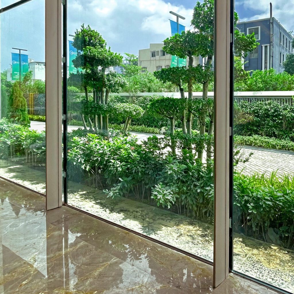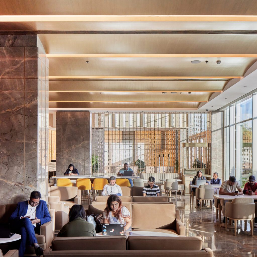 The Woods and The Greens spill over into balconies on the southwest facade. The vertical fins abutting the open terrace are designed as shading devices that filter the harsh sunlight. With trellis-guarded projections, the southwest facade allows filtered permanence of breeze into thez double volumes of the workspace. The transparent veil of the insulated glass promises a clear connection to the outside and infuses the internal workspace atrium with natural light without heat gain. It is designed to mitigate excessive glare. With this, the LPD Index—a yardstick to gauge the electrical load per square unit—is also lowered by 32%. Through the controlled lighting layout, technical cut-sheet, intelligent lighting fixtures and tactical HVAC design, the overall planning could facilitate a sustainable, post-construction life-cycle of the building.